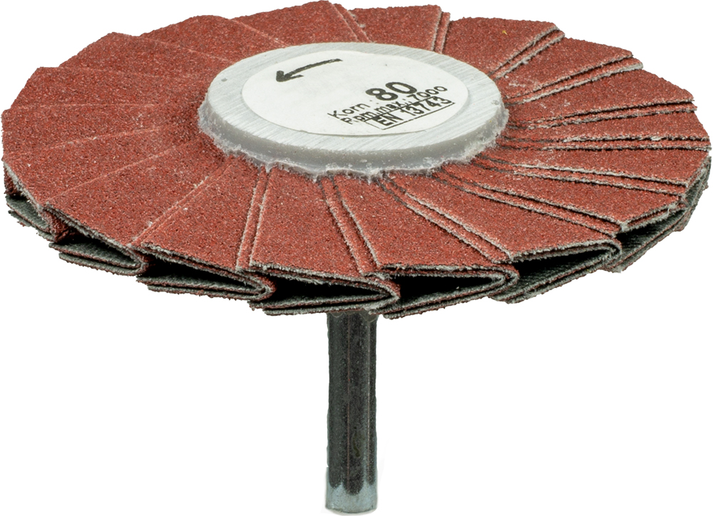 Gefaltete Schleifscheiben auf Kunststoffkern, für Biegewellenmaschinen oder Spanndorn. Ø 80 mm (Schaft) bzw. 160 mm (Bohrung).